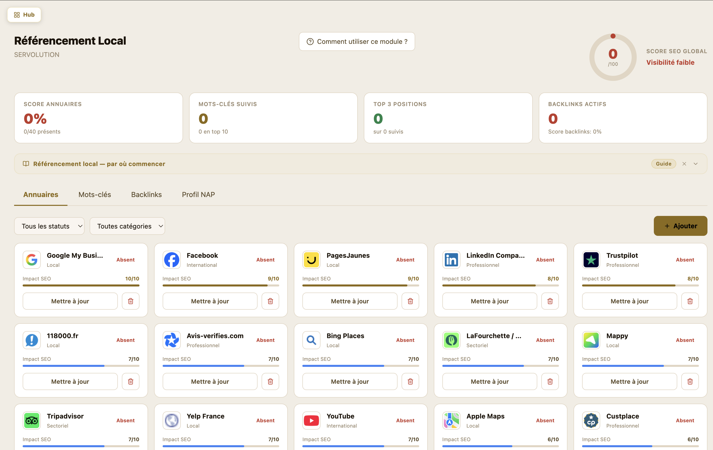 Servolution est un logiciel SaaS de gestion tout-en-un concu pour les PME, TPE, artisans, commercants et independants. Developpe integralement en France, il reunit dans une seule plateforme l'ensemble des outils dont un dirigeant a besoin pour piloter son entreprise au quotidien : gestion commerciale, CRM, projets, planning, mailing, reseaux sociaux, SEO, IA creative et academie de formation.